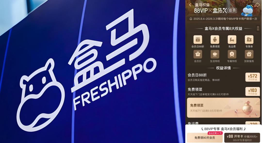 8月4日,淘宝88VIP新增一项会员权益,淘宝88VIP用户可领取一张有效期为90天的盒马X会员体验卡。淘宝88VIP首次与盒马会员体系的打通。