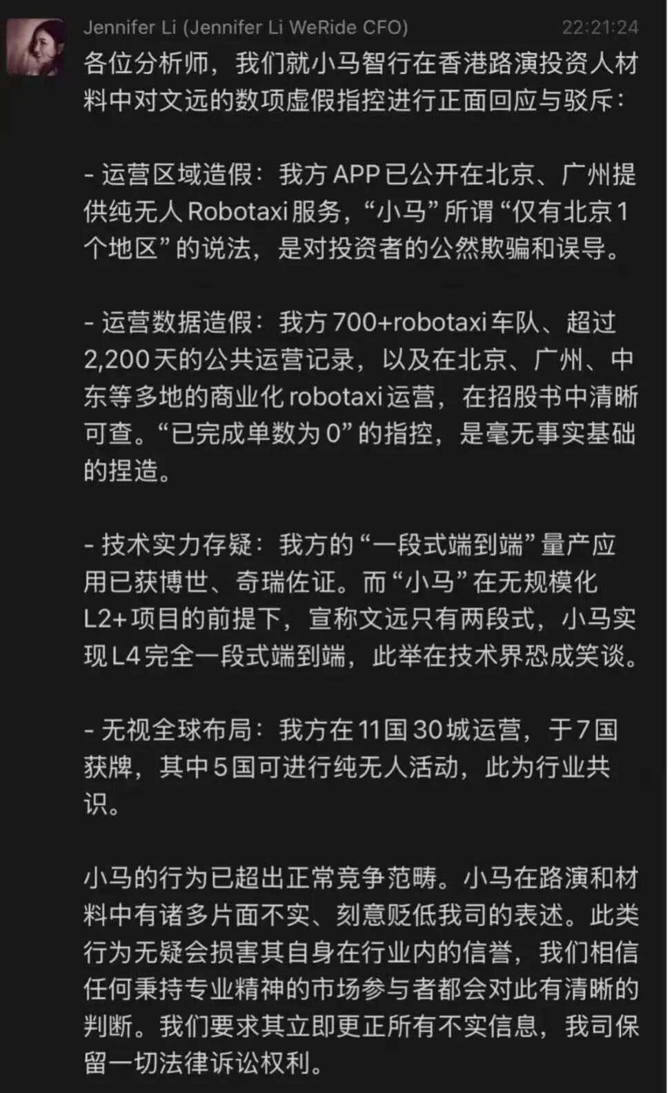 这一举动迅速引燃战火。文远知行CFO李璇连夜发文,声称要正面回应小马的“虚假指控”,并就运营区域、运营数据、技术实力及技术路线逐一进行驳斥。她直言不讳地指出:“小马的行为已经超过正常竞争范畴,有片面不实、刻意贬低的表述。”