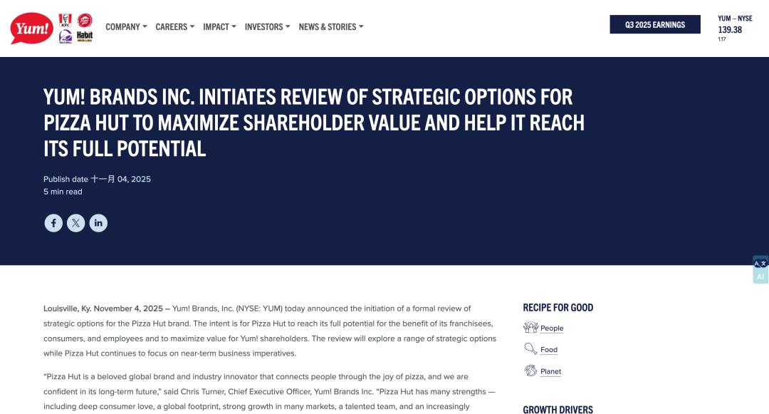 Yum! Brands宣布对必胜客启动战略评估:全球CEO暗示或会出售,百胜中国回应