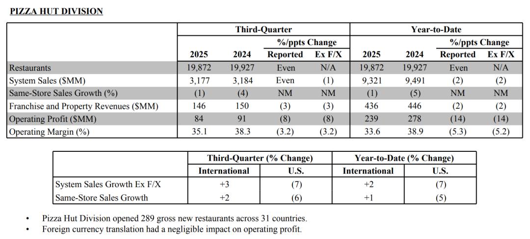 但是,必胜客品牌则呈现另一番景象。根据Yum! Brands的三季报,必胜客全球门店数超过1.98万家,系统销售额为31.77亿美元,同比下降-1%,营业利润同比下降8%,营业利润率统计下降3.2%。今年以来,其营业利润更下降14%。