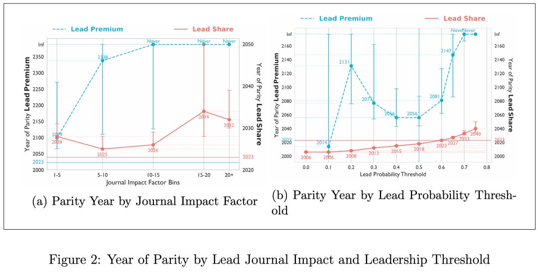即使将期刊按影响因子分层,中国与美国在高影响力学术期刊上的合作领导权也预计将在2034年前后持平。