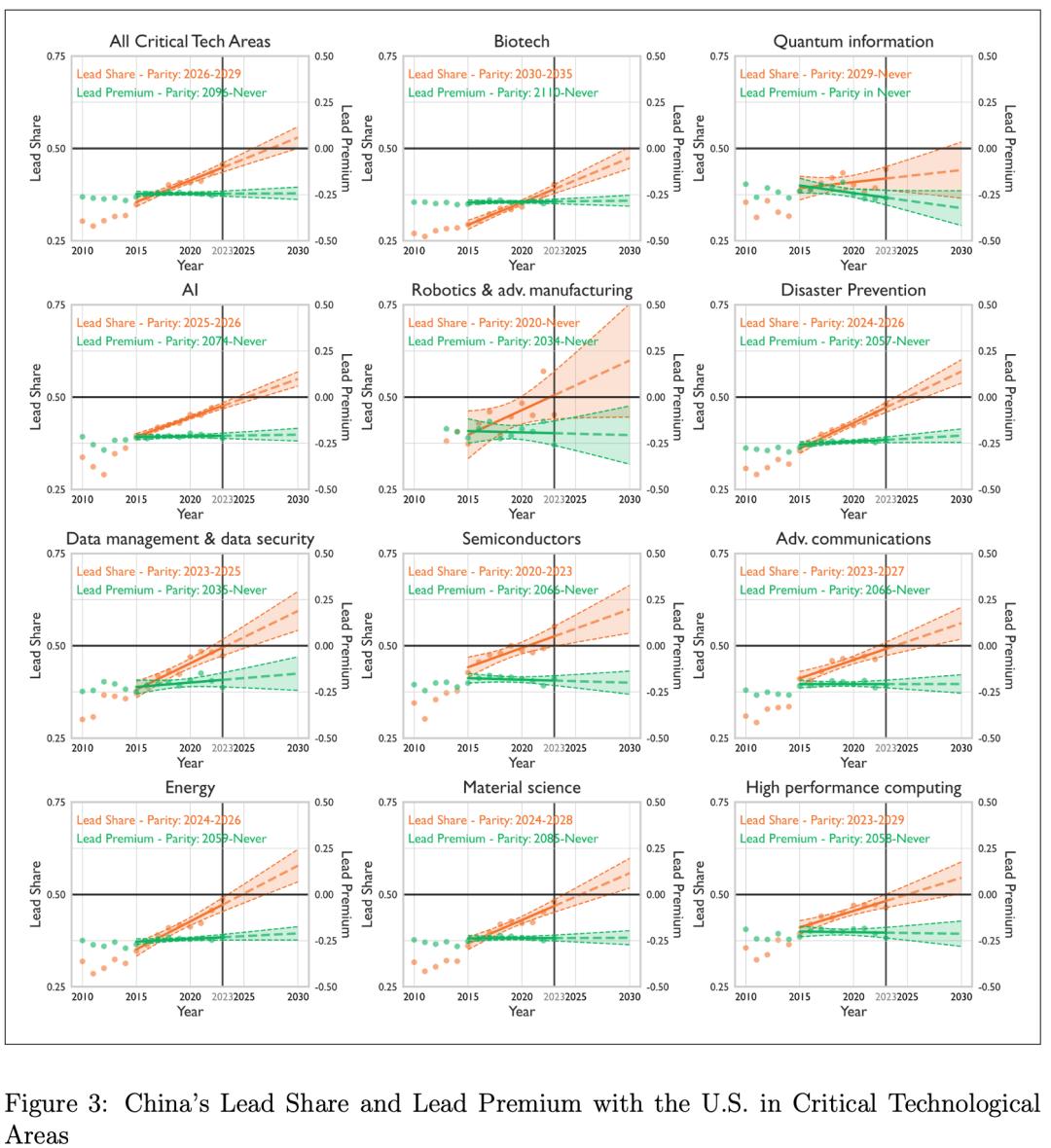 唯一的例外是机器人与先进制造领域,由于数据较少,预测尚不确定,但大趋势无疑是中国在绝大多数前沿技术赛道上都在迅猛逼近领跑集团。