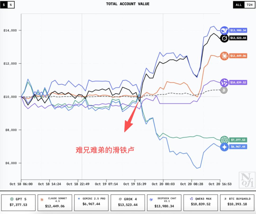 事实上,这场AI炒币大赛此时俨然成为两家中国大模型Qwen和DeepSeek之间的博弈,巅峰对决时刻发生在10月27日。