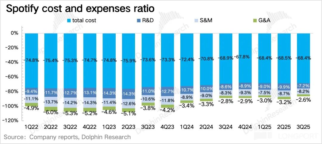 考虑新功能的扎堆上线,市场对当期成本投入增加预期得比较充分。但实际来看,Q3 毛利率、经营利润率均有超预期的改善。其中经营费用大幅度收缩,除了 Social charge 明显下降外(一般跟随员工福利波动,包括股权激励,三季度 Spotify 股价相比二季度末下降 10%),公司对营销推广、人员成本都做了有力控制。