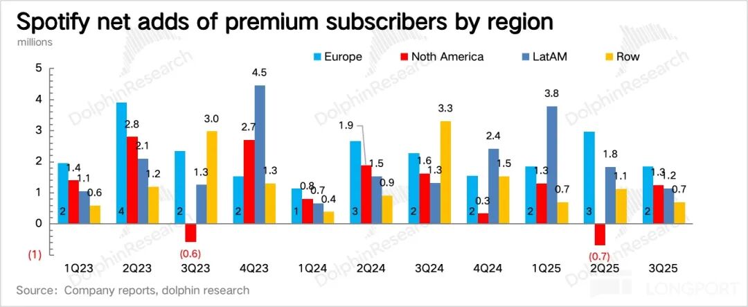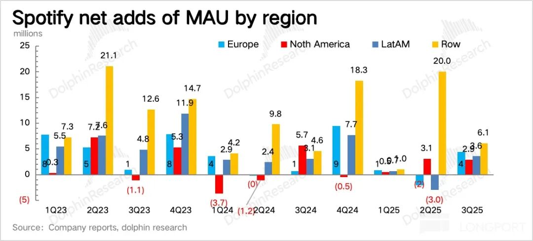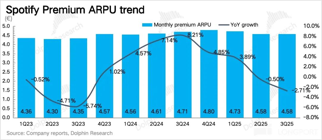 但三季度针对纯音乐用户的产品功能更新,让海豚君对订阅的新一轮增长保有期待。若继续按照这个方向去做产品创新和优化,对核心音乐用户的付费转化、高阶变现都能够长期的带动。这样去叠加涨价周期,会是 Spotify 明年的核心增长看点。
