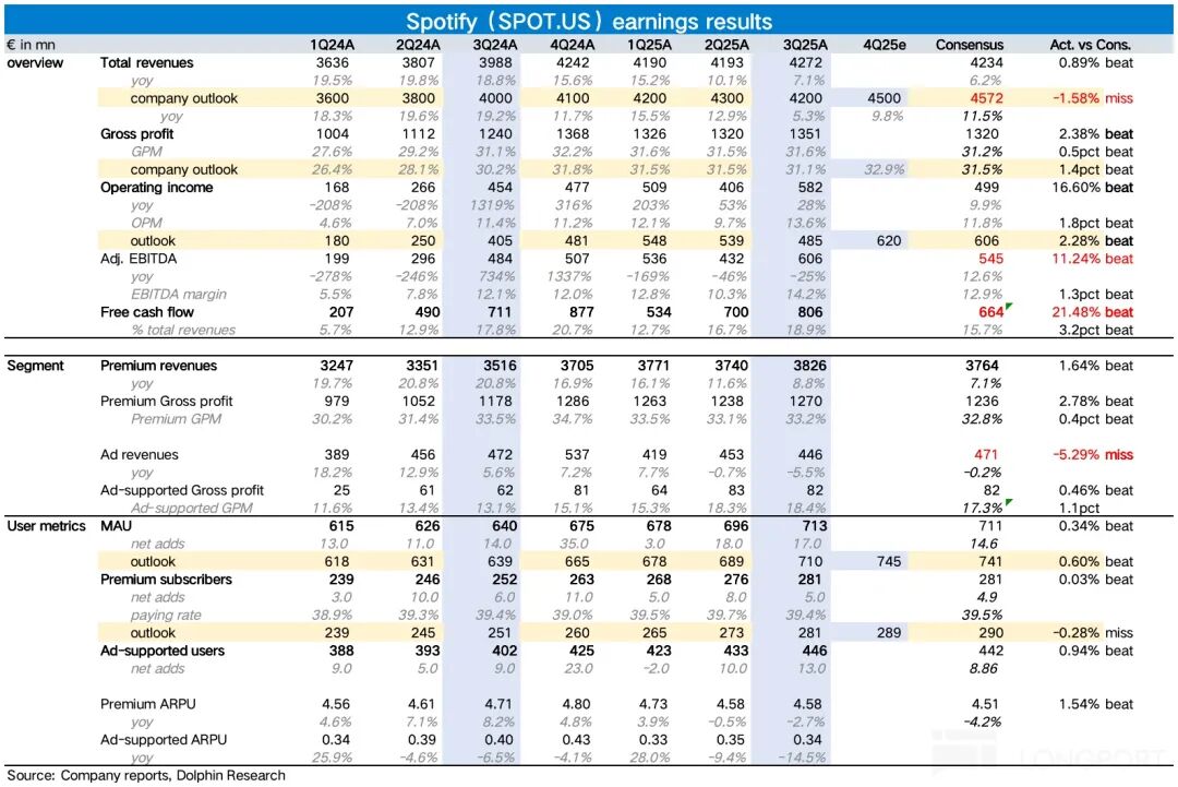 Spotify 2025 年三季报在 11 月 4 日美股盘前出炉,业绩表现好坏参半。但或许市场主要担忧点——利润率,实际超预期,从而带来了略偏积极的市场反馈。