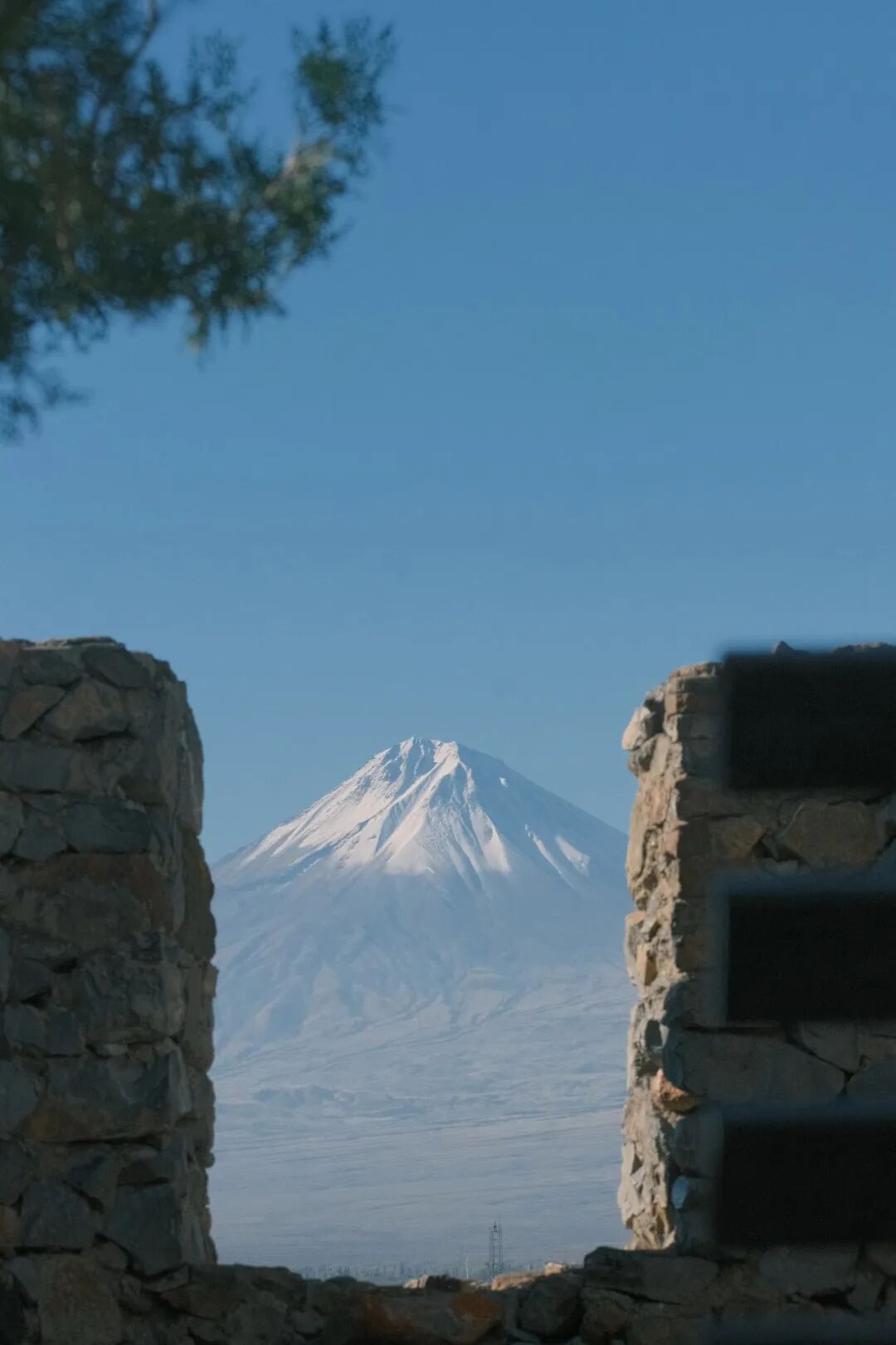 亚拉拉特神山,山顶常年积雪,从深坑修道院向下眺望,可以看见铁丝网切割出的土耳其与亚美尼亚的边境线。