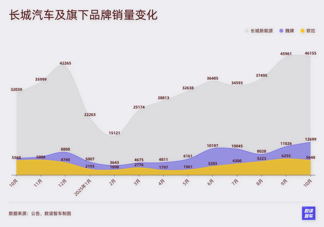 长城新能源在10月也开始提速。46155的销量,连续第二个月站上4万台,这同样也是未曾达到过的成绩。