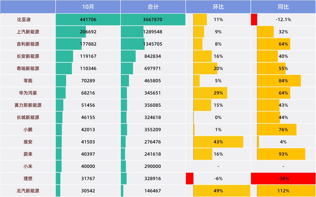 突破4万已经是基础门槛,10月车企销量的中位数已经达到51456台,去年同期可以排到第四名。同比增加了10609台,环比也增加了5495台,年底冲刺销量的关键阶段,车企都铆足了劲儿。