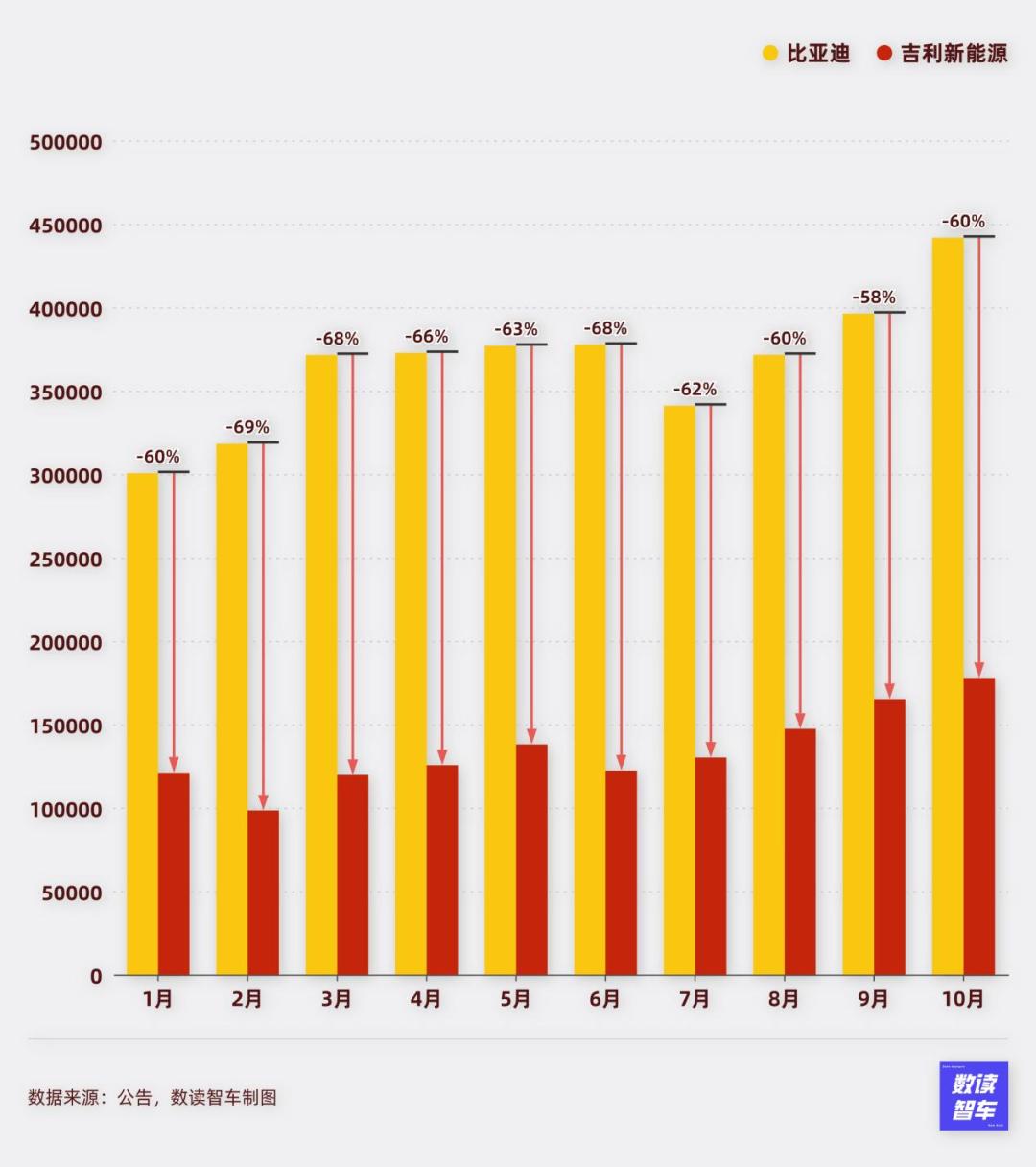 同时,吉利已经有了叫板比亚迪的品牌线——银河系列,10月销量直接飙升到12.7万台,创造了历史新高的同时,也已经连续第三个月销量破10万,稳定成为比亚迪王朝与海洋系列之外,又一个全民热门款车型。