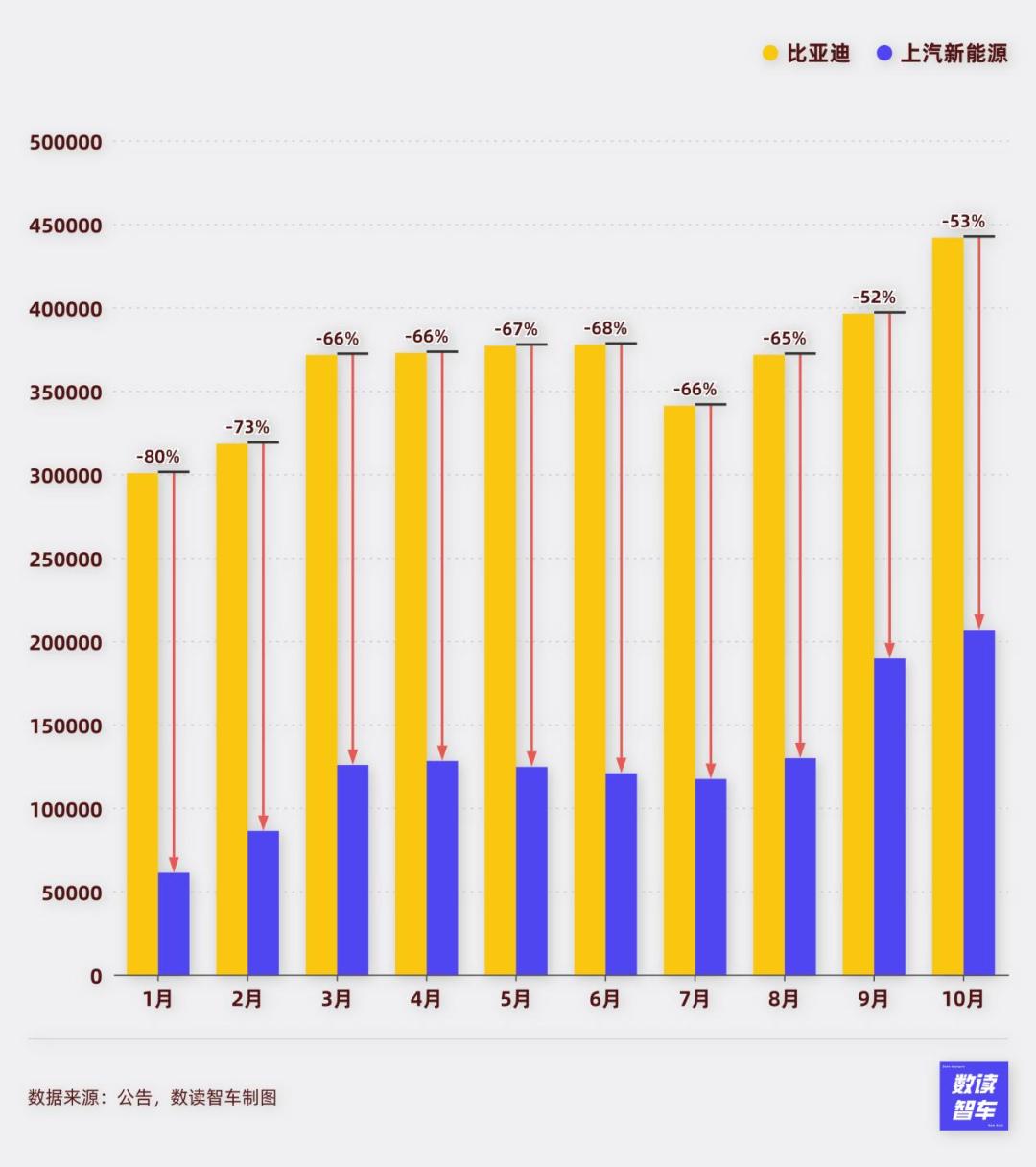 上汽新能源10月销量历史性地首次突破20万台,成为比亚迪之后第二家站上20万关口的车企,增长势头非常迅猛。上汽的旗舰品牌智己也终于站稳了新台阶,10月销量13159台,首次连续两个月销量破万。