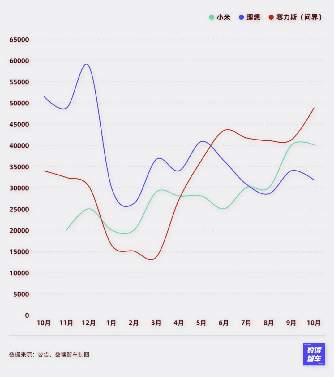 目前来说,华为可能是一个正面案例。10月,鸿蒙智行销量达到68216台,继9月历史性突破5万台后,10月大幅度逼近7万台。这当然与鸿蒙合作车型增加有关,但仅看问界,这个定位高端的品牌,已经悄然间连续5个月销量破4万。