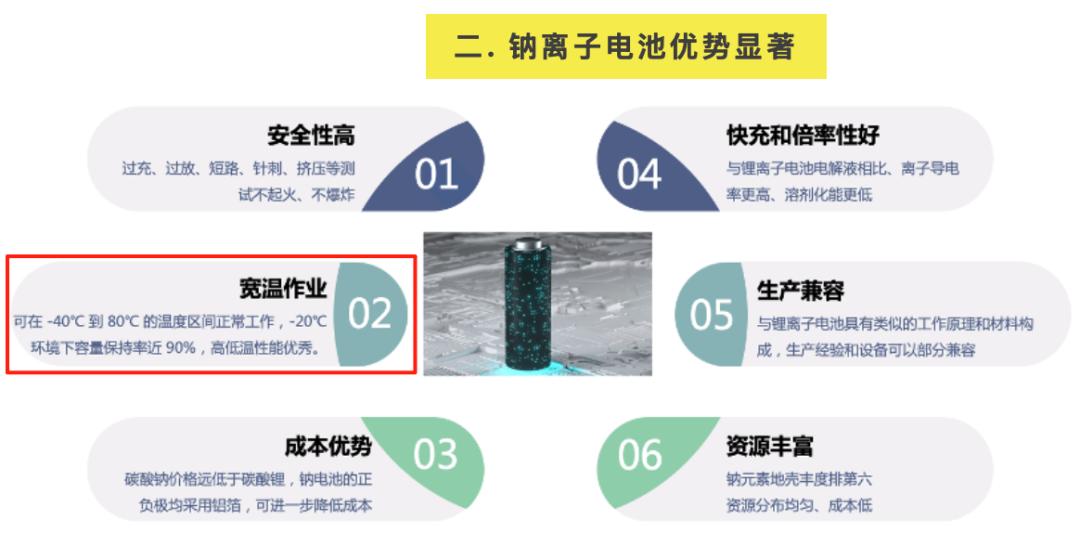 这首先得益于钠离子独特的物理和化学性质,有了“不怕冷”的体质,再配上凝固点低的电解液,造就了它在零下40℃甚至更低的温度下,仍能保持液态和良好的离子导电性。