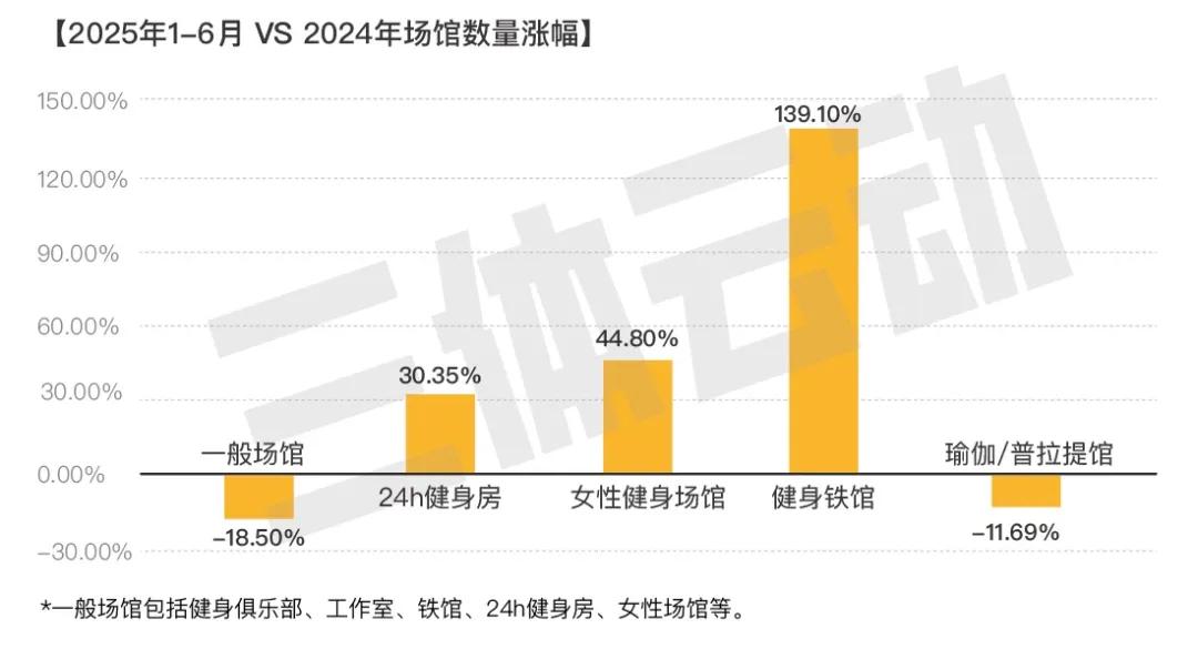 专注于力量训练、器械更丰富、训练内容更硬核的「铁馆」更是增长迅猛。根据来自三体运动的数据,2025年1-6月,国内铁馆的数量已经从去年同期的603家增加到了1442家,涨幅139.1%,成为了增长最快的细分健身场馆。