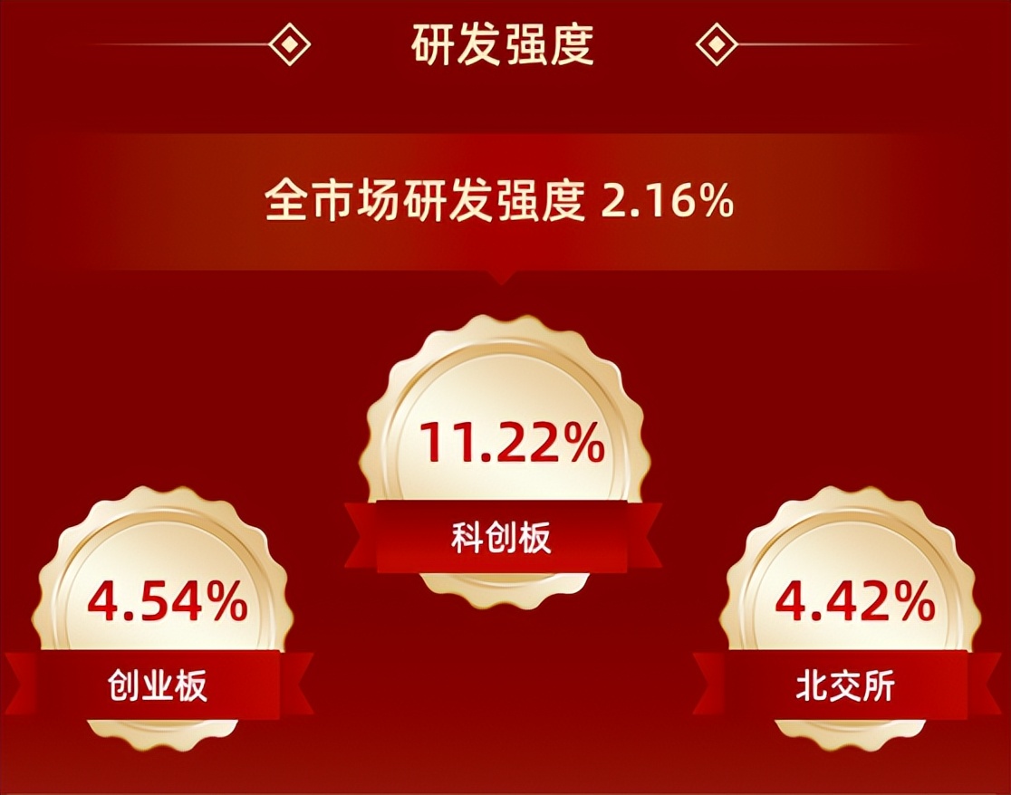综合来看,A股全市场研发投入强度(研发投入占营收的比例)为2.16%。科创企业的研发投入积极性更高。分板块来看,科创板企业研发投入强度高达11.22%,远超其他板块。创业板、北交所研发投入强度分别为4.54%、4.42%,也高于市场整体水平。