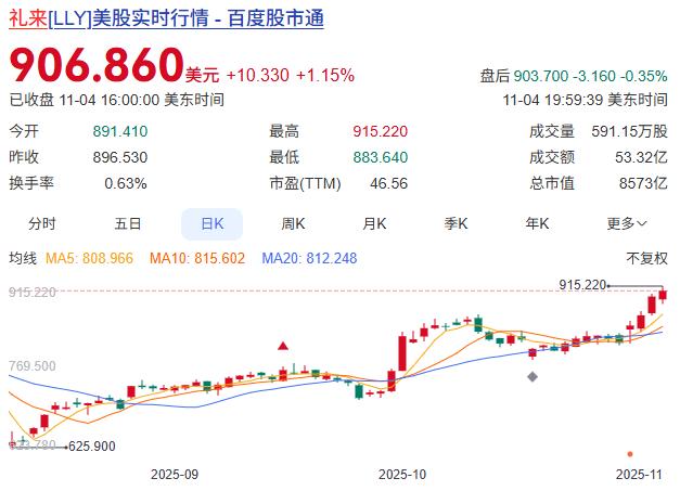 这一消息立刻在AI及制药行业激起巨大反响 ,为美国已经炙手可热的AI资本支出再添一把燃料。礼来股价也顺势高位拉升,从830美元左右突破900美元大关,最高涨至915美元左右,显示出市场对于这一宗合作的看好。