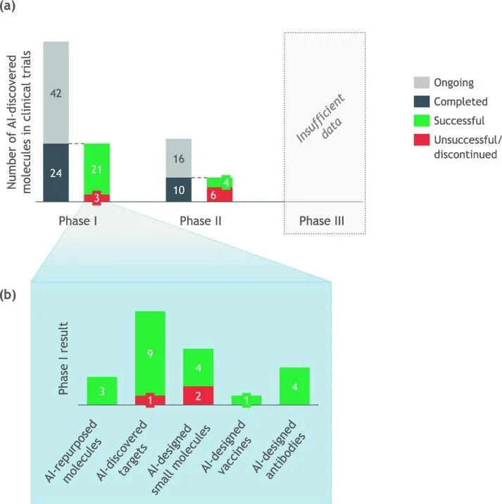 作者认为,高I期成功率可以通过AI算法在成熟分子系列的数据上进行训练来解释,这些算法可以非常有效地微调和优化。由于II期通常涉及生物或机械概念的证明,这表明AI算法虽然可以识别与疾病相关的靶点和途径,但仍有改进的余地。