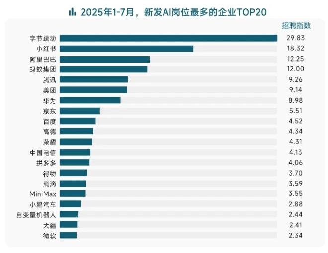 根据脉脉基于各大厂在其平台新发布AI岗位数量计算的“AI招聘指数”,字节跳动高居榜首,小红书和阿里巴巴集团分别位列第二、第三,蚂蚁集团、腾讯、美团、京东等公司紧随其后。