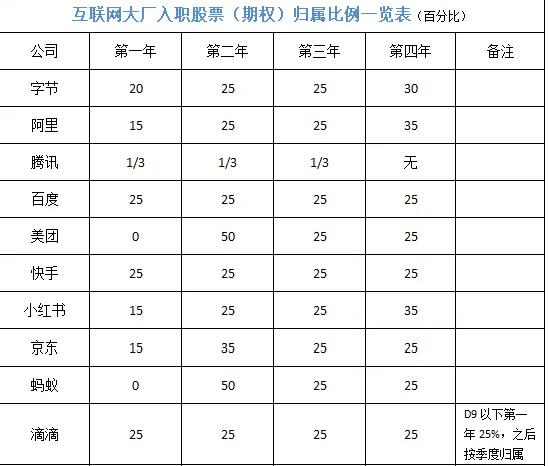 腾讯则是入职时只给3年股票,3年各归属1/3。快手和百度是每年归属25%。美团目前仍按照0,50%,25%,25%的形式归属,总体来说都是拉长了期限,鼓励员工待得越久激励越高。