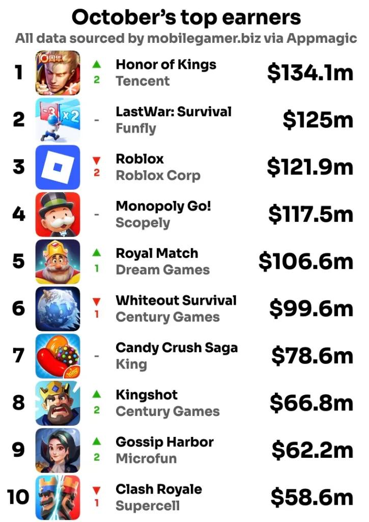 《Roblox》排名第3,其营收较夏季的历史峰值明显回落——夏季时它的单月内购收入(IAP)曾超过1.5亿美元。10月该游戏营收1.22亿美元,与9月基本持平,且远高于夏季爆发前每月1亿至1.1亿美元的常规水平。