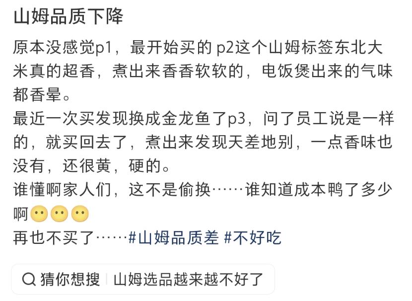 对山姆而言,这种阻力就表现在:你为了后续扩张所做出的各种动作,会引起原有用户的巨大不满——中产消费者当初选择给你山姆充会员费,是基于你之前二十年精品策略所积累下来的口碑,但现在,你突然要扩张了、突然要换策略了,甚至也没和我们商量,那可不就有情绪了么。