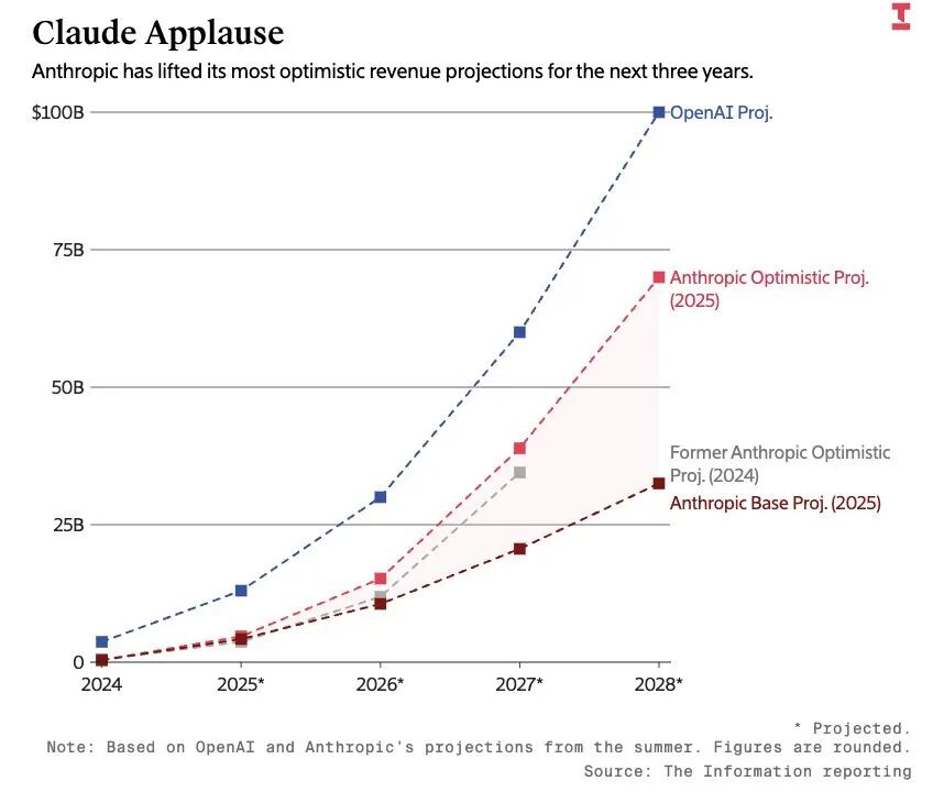 Anthropic发展势头强劲。根据The Information报道,Anthropic将其未来三年营收增长的乐观预测分别上调了约13%至28%不等: