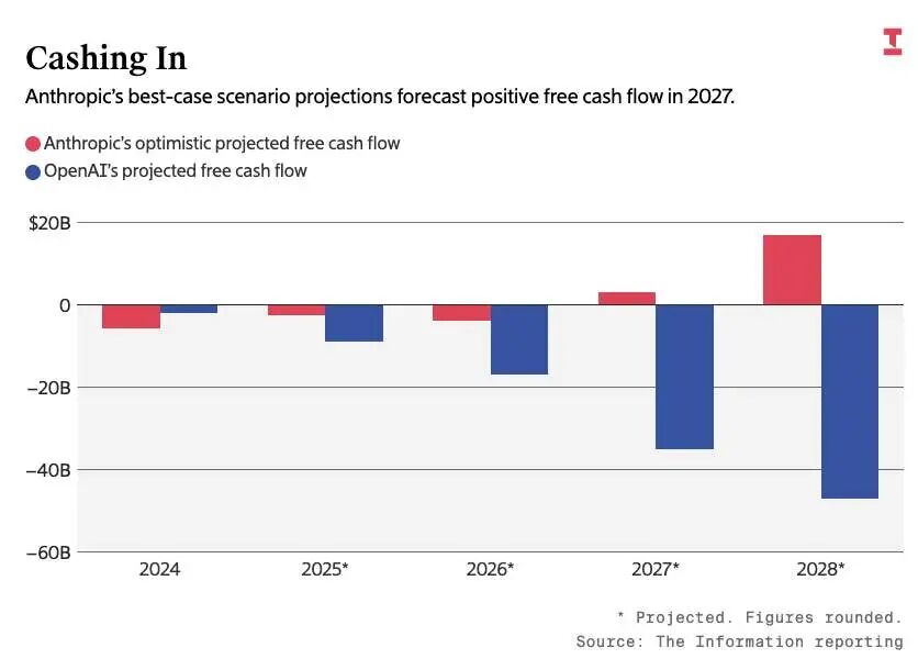 OpenAI的业务涵盖广告、电商、AI硬件等多个领域,虽然营收规模更大,但其现金消耗也更高。根据The Information报道,OpenAI在2030年才能实现现金流转正,而Anthropic声称预计最早在2027年就能转正,并预计到2028年其现金流可能高达170亿美元。
