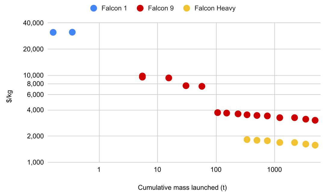 从 Falcon 1 到 Falcon Heavy,SpaceX 已把发射成本从 $30000/kg 降到 $1800/kg;而 Starship 的目标,是 10× 可重复使用率下的 $60/kg,极限情况下可降到 $15/kg。