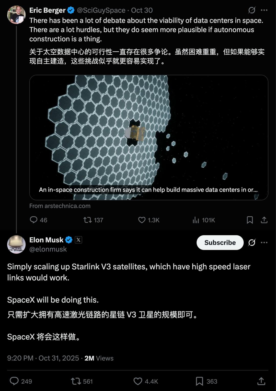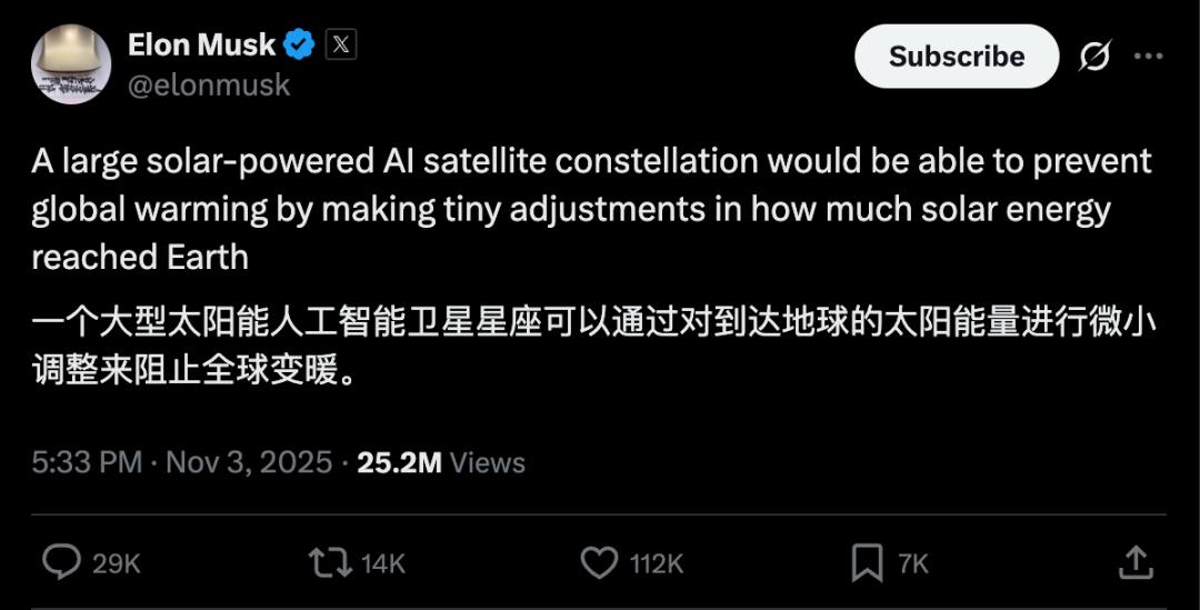 马斯克发 X 说太空的 AI 卫星能保护地球