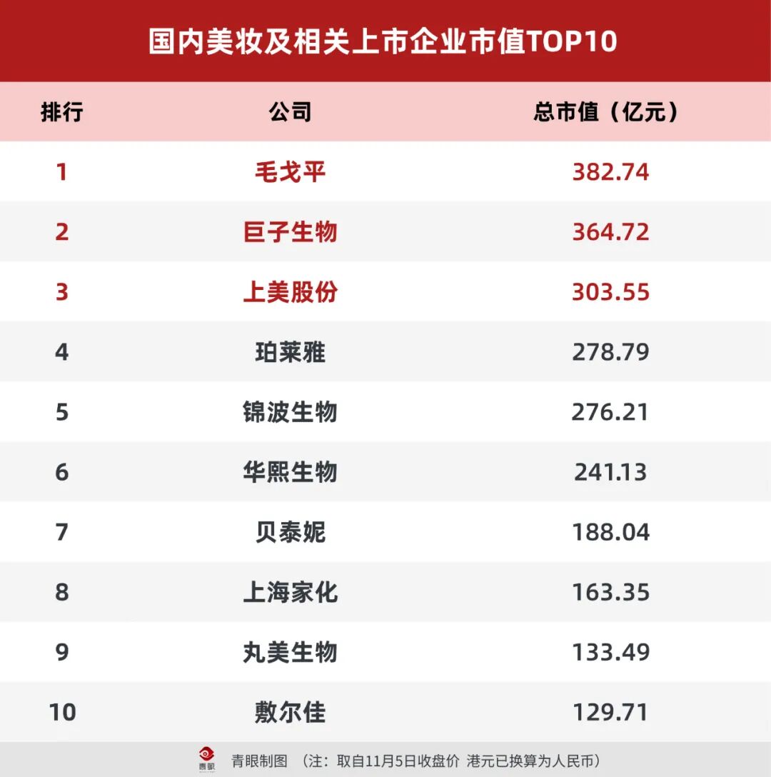 据青眼梳理,巨子生物、毛戈平等国货美妆企业市值均曾一度超过500亿元,但受股价波动影响,当前国内尚无突破500亿市值的美妆企业。