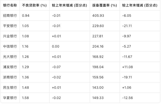 其余8家股份行不良贷款率处在1%-1.5%的区间。除兴业银行、光大银行、民生银行不良贷款率较2024年末抬升0.01个百分点外,其他银行均持平或下降。其中,浦发银行不良贷款率为1.29%,较上年末下降0.07个百分点,降幅最大。