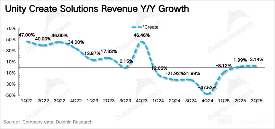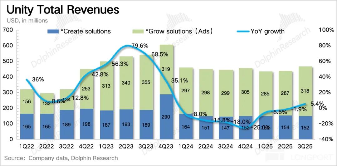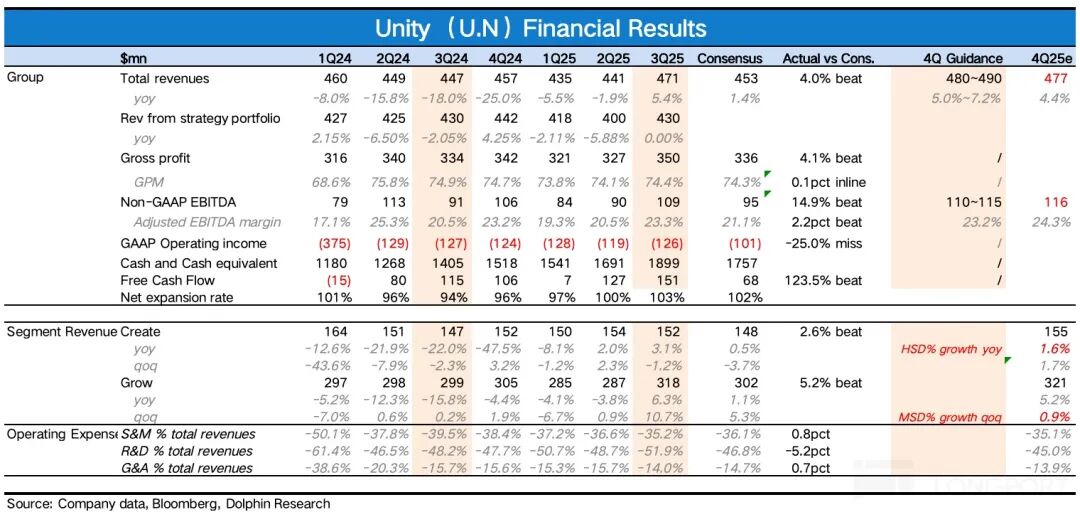 Unity 三季度实现总营收 4.7 亿美元,同比上涨 5%,小幅超出公司指引和市场预期。上季度我们说 Unity 的经营拐点确立,三季度则进一步认证了向好趋势。