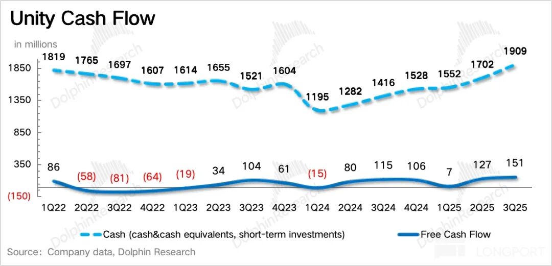 4. 更改无形资产的摊销年限:虽然当下处于转型关键期,可以对利润要求不那么苛刻。但如果能够超额完成减亏盈利指标,那肯定更好。三季度 Unity 正是这个情况,Non-GAAP EBITDA 利润率环比增加 3pct,主要来自费用的优化。另外,受益于主业的改善,自由现金流达到 1.5 亿,是公司历史上最高一次自由现金流规模。