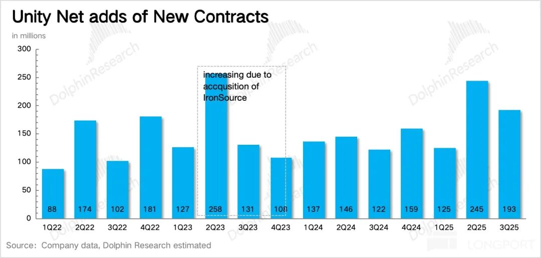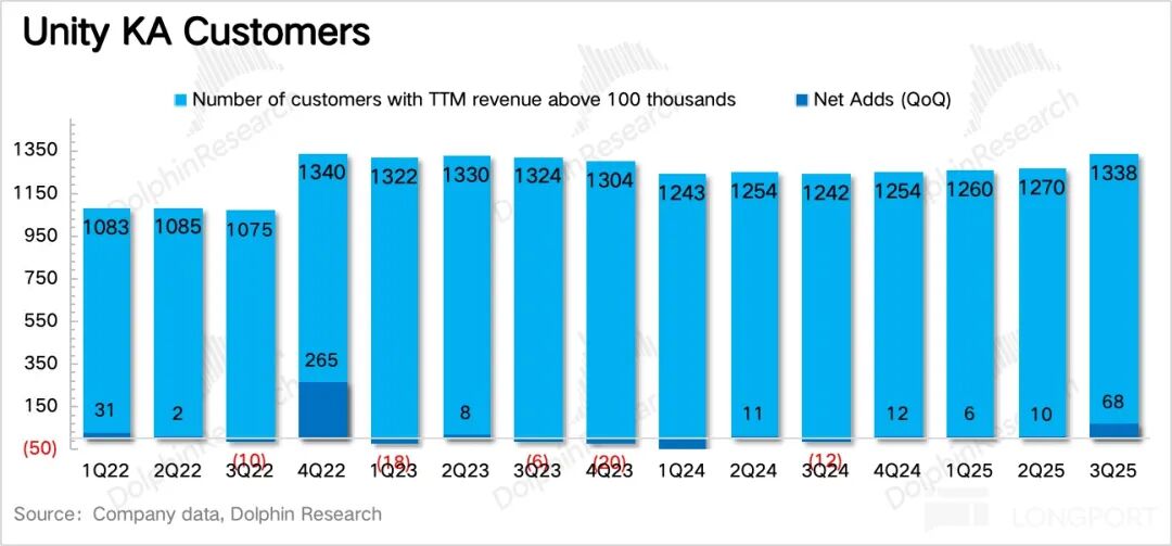 (3)大客户数环比净增加 68 家,非常亮眼的超预期,这个净增规模,剔除收购 ironsource 这种外延并购带来的新增变化,还要回溯到 2021 年 Unity 的辉煌时期。我们估计,这里面除了 Unity 6 的老客户本身合同额升级,主要增量来自于 Vector 下的广告客户。