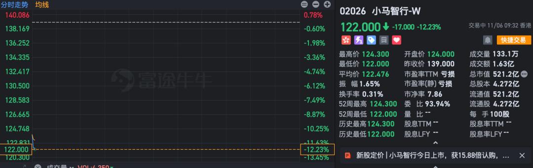 开盘4分钟,小马智行跌12.23%,股价报122港元(约合人民币111.02元),市值521.2亿港元(约合人民币474.3亿元)。