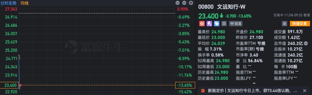 开盘4分钟,文远知行跌13.65%,股价报23.4港元(约合人民币21.29元),市值240.2亿港元(约合人民币218.5亿元)。