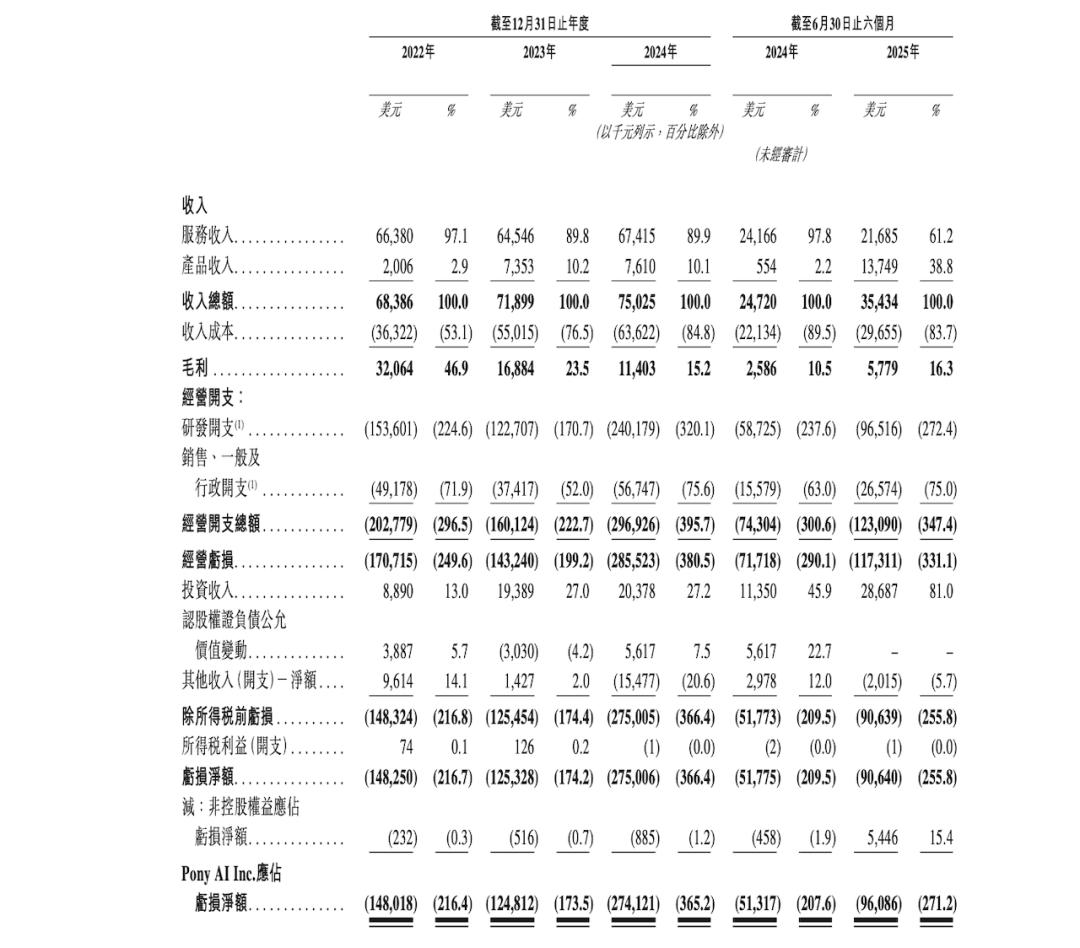 文件显示,小马智行的年度收入从2022年的6838万美元(约合人民币4.9亿元)增长至2024年的7503万美元(约合人民币5.3亿元)。截止到2025年第二季度,其营收达到3543万美元(约合人民币2.52亿元)。
