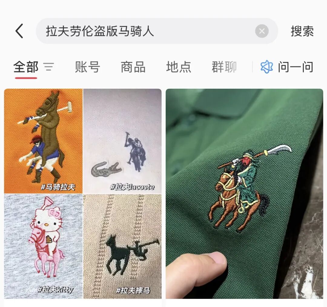 如今在小红书搜索拉夫劳伦,自动关联的“猜你想搜”就有“拉夫劳伦盗版马骑人”专属词条。