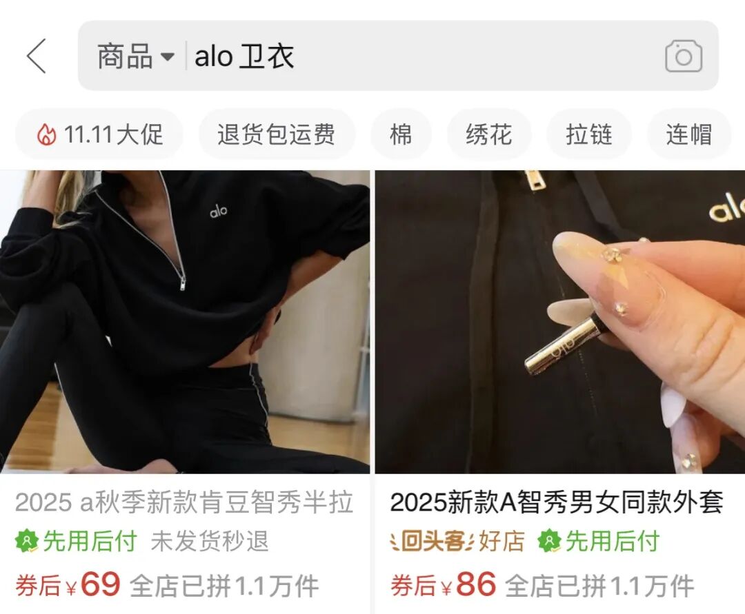 部分促销款甚至低至 10 元左右,一些印着 ALO字母的卫衣,券后拼单更仅需69元。其销量却不容小觑,个别店铺的累计销量超过万件。
