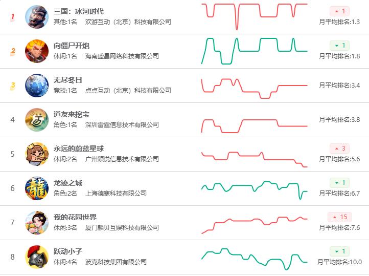 头部阵营排名再度易位,《三国:冰河 时代》重回 微 信小游戏畅销月榜第一, 《向僵尸开炮》下滑之第二, 《无尽冬日》 《道友来挖宝》 则维持在月榜第三、第四名的位置。《永远的蔚蓝星球》环比排名上升3名,进入月榜第五名。