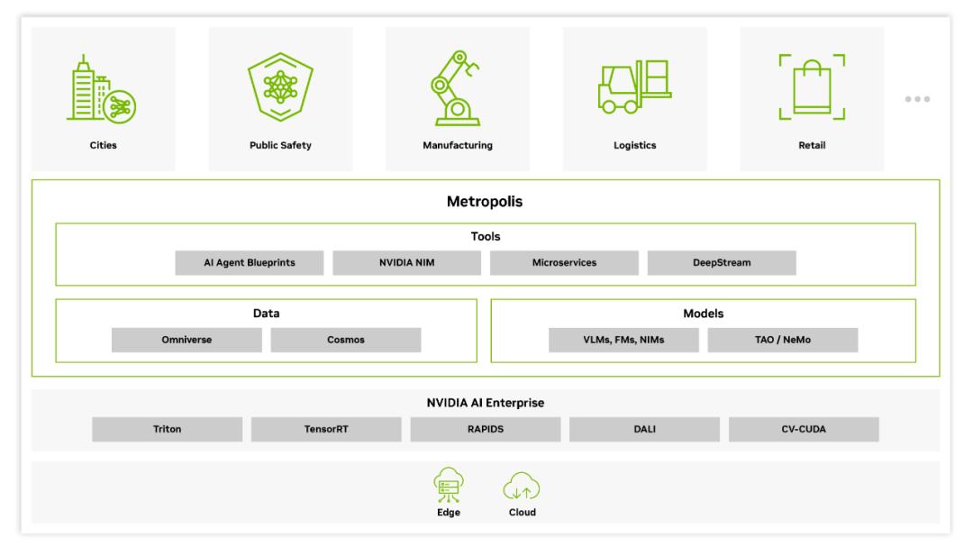 在动态现实场景中,物理AI需要低延迟感知和实时决策(如自动驾驶避障、智慧城市交通调度),Metropolis 通过“边缘视觉分析+算力协同”构建感知底座,既可以通过感知设备进行多模态物理动态捕捉,还能在边缘端进行实时推理加速秒,满足物理AI毫秒级动作生成需求。
