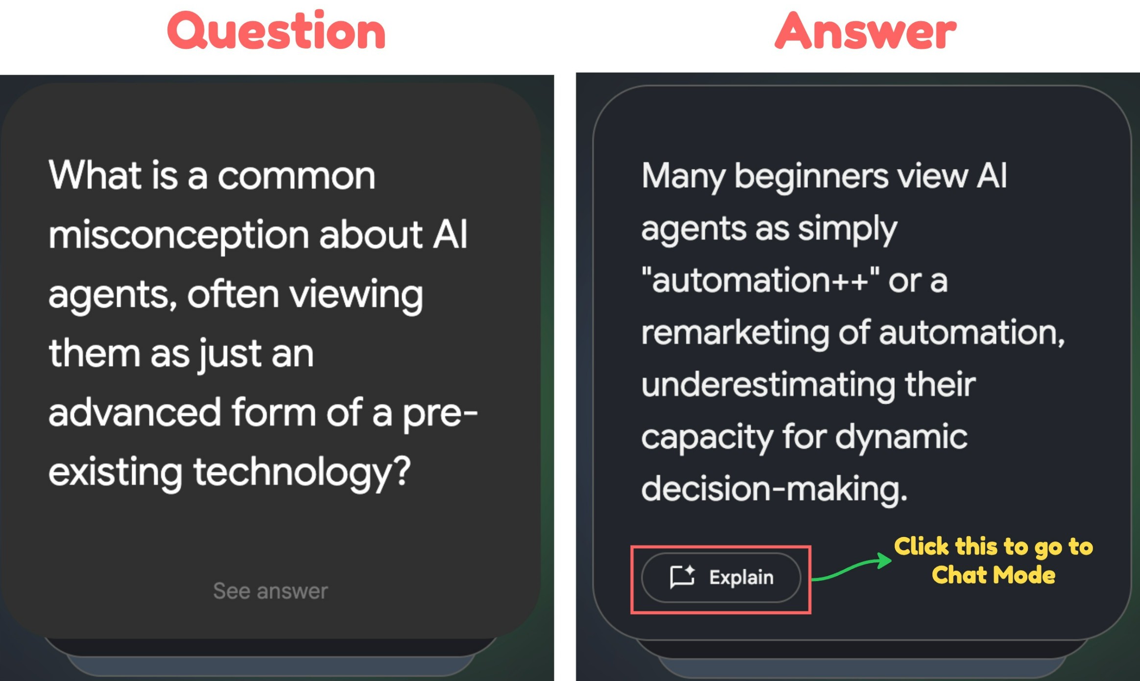 看到了吗?这些闪卡完全是根据我的自定义指令量身定做的。如果我想问某个答案背后的逻辑,我可以点击“解释”,它会带我到聊天区,在那里我可以进行更深入的探索。