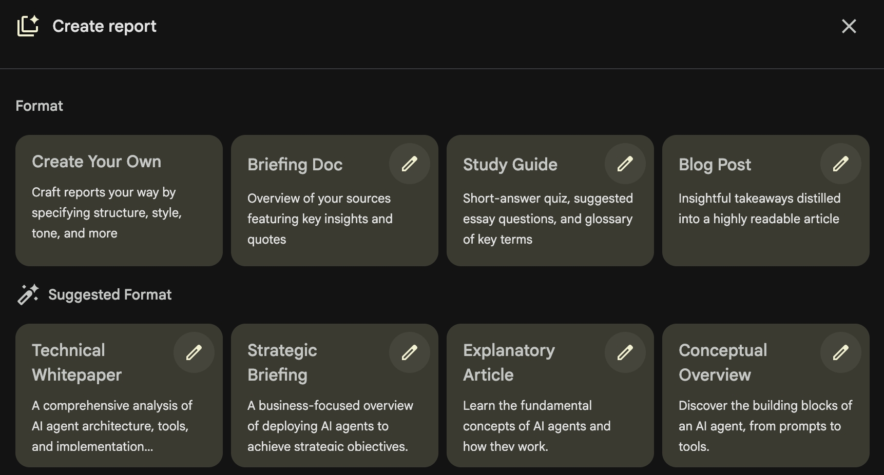 NotebookLM 有一个“报告”功能,提供多种格式:博客文章、简报、学习指南,以及根据你上传的文档自动建议的四种额外选项。你可以用自定义指令来生成它们,也可以自己编写。