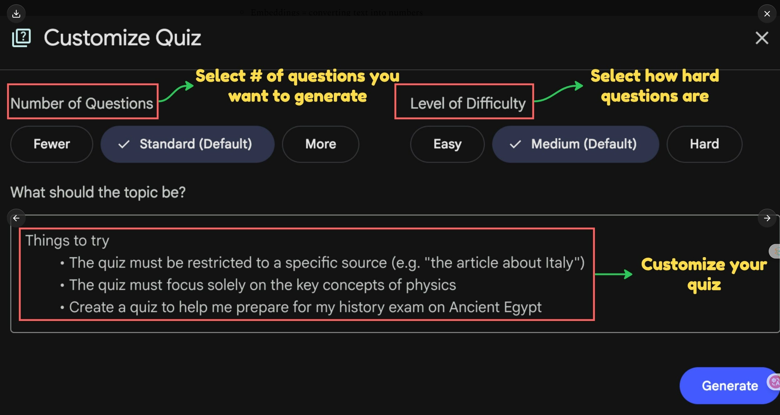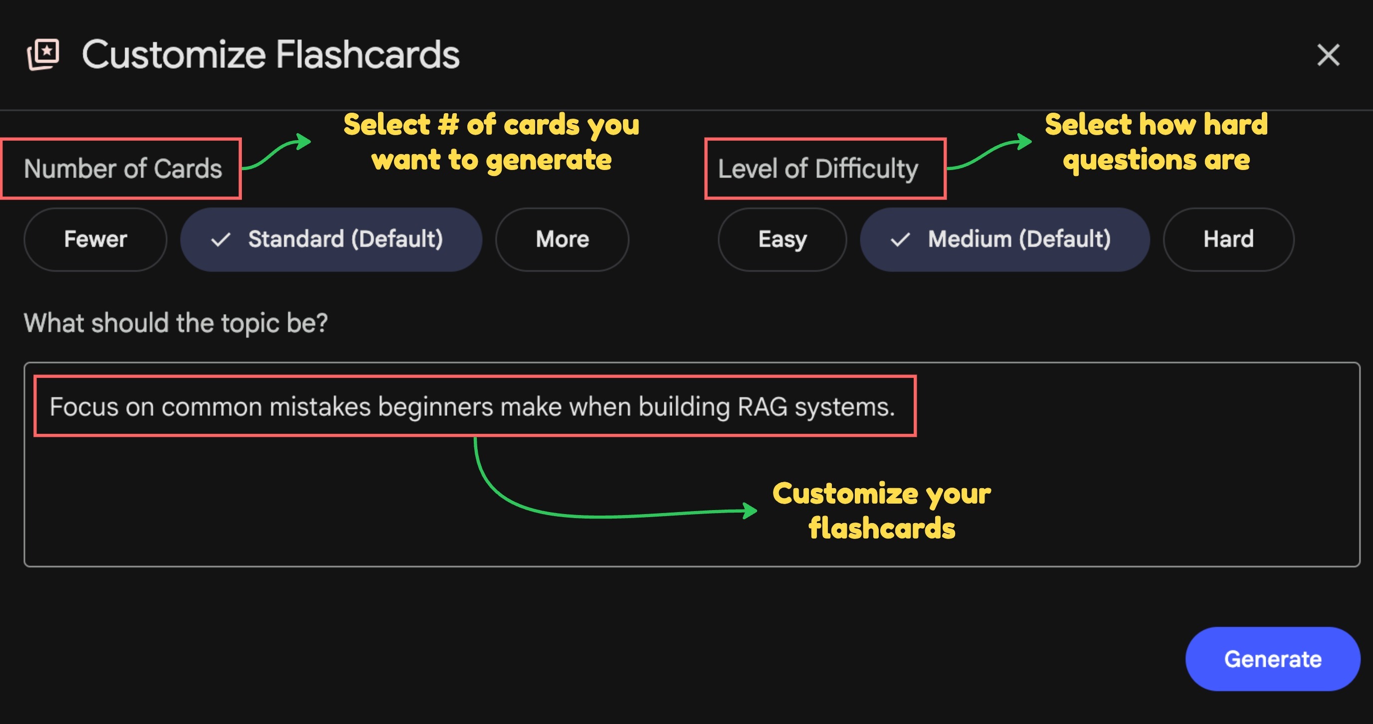 NotebookLM 的“闪卡”功能让你能用自定义指令生成卡片,并能就任何答案要求解释。你可以选择制作多少张卡片,还可以调高或调低难度。最终结果是:一个高度定制的学习环节。