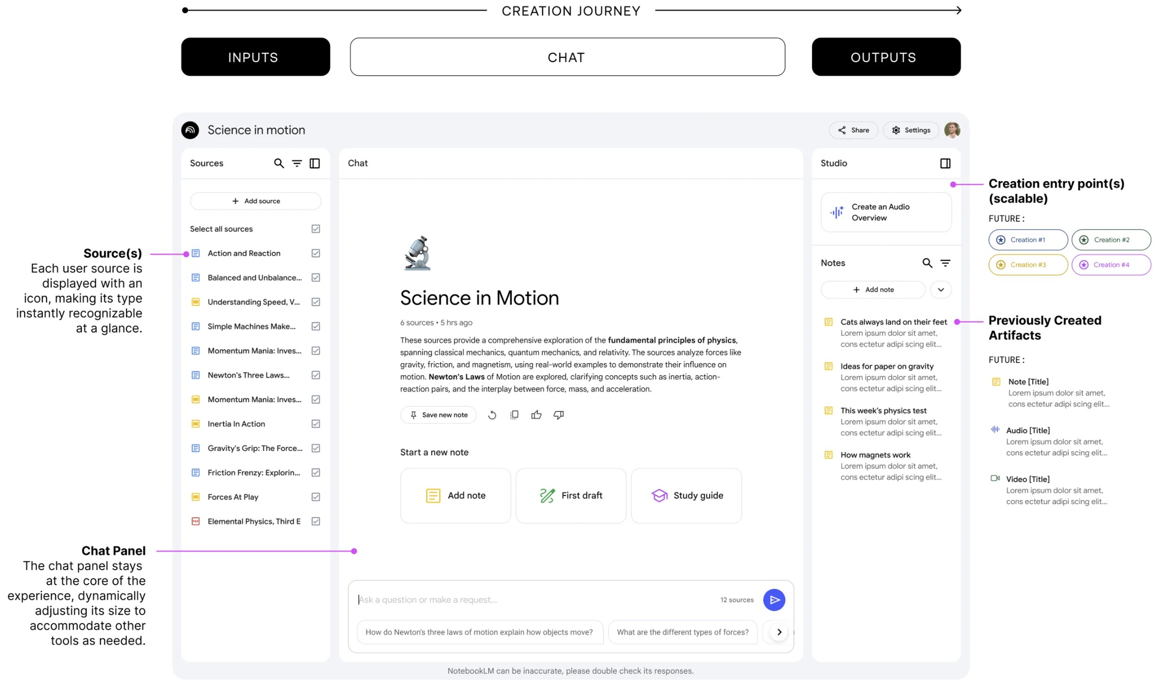 在继续之前,我想特别提一下 Jason Spielman,他是 NotebookLM 背后的艺术家兼首席设计师。他早期的草图和实验造就了今天的版本。我对这个设计的复杂性感到惊讶——就像看着一个打磨精良、开箱即用的成品送到你家门口。如果你喜欢产品开发的艺术,你可能会想看看他讲述的 NotebookLM 的早期开发故事。