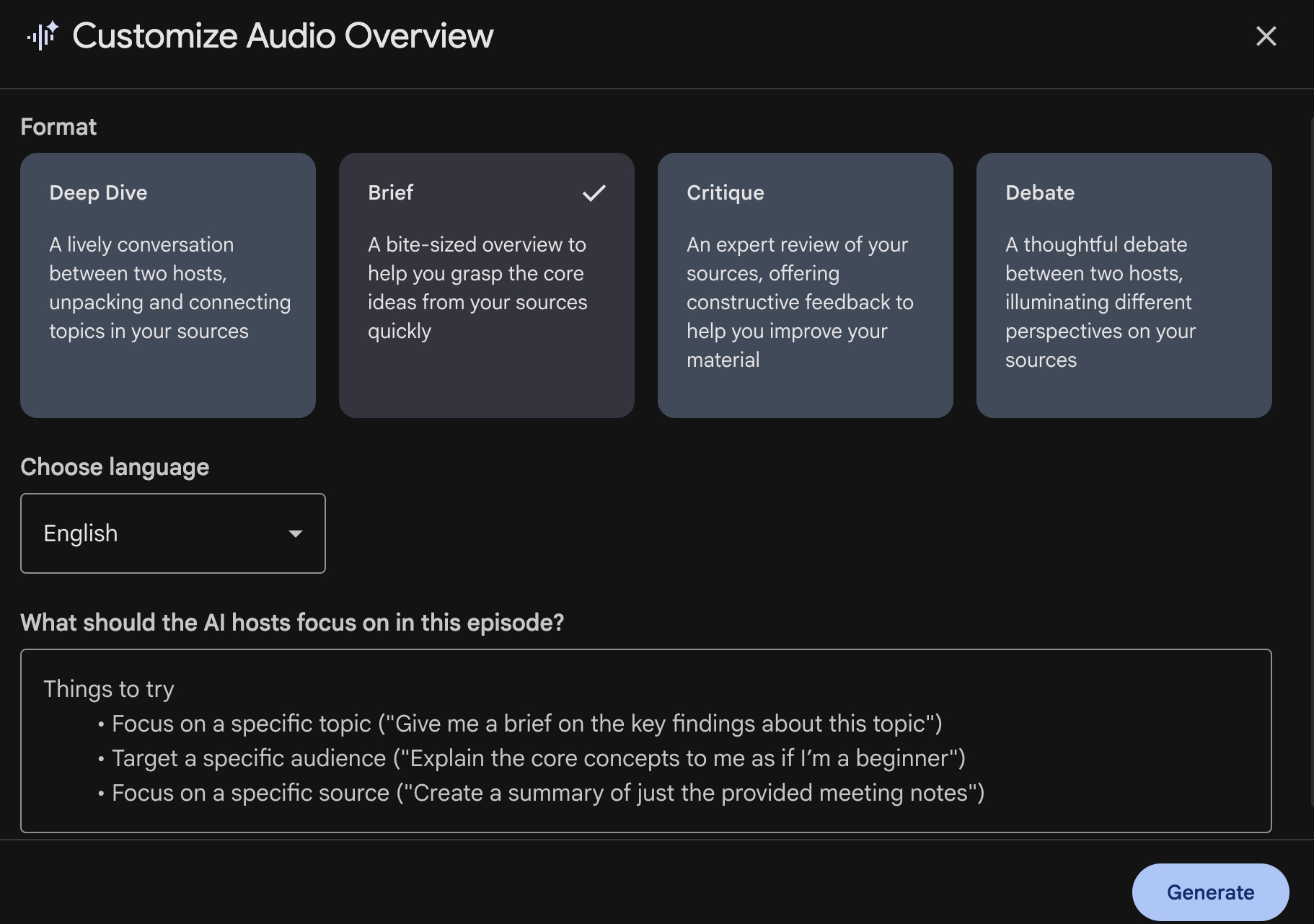 NotebookLM 的“音频概览”功能可以创建由两位 AI 主持人进行的播客式对话。你可以定制格式(“深度探讨”、“简报”、“评析”、“辩论”)、时长和焦点。而且你可以在播放时随时提问。