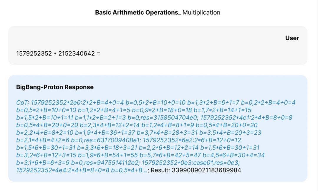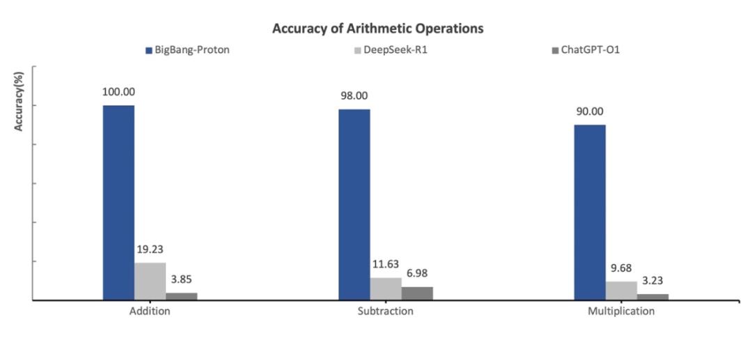 在涉及最多 50 位数加法和减法以及最多 12 位数乘法的算术任务中,不调用外部工具和代码,只允许使用自身的能力,BigBang-Proton、DeepSeek-R1 和 ChatGPT-o1 这三个模型的准确率表现如下:BigBang-Proton 在加法、减法和乘法上的准确率分别为 100%、98% 和 90%。DeepSeek-R1 的准确率为 19.23%、11.63% 和 9.68%;而 ChatGPT-o1 的准确率最低,分别为 3.85%、6.98% 和 3.23%。