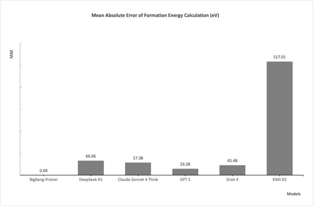 超对称团队将主流推理 LLMs(包括 DeepSeek R1 (MAE: 66.056 eV)、GPT 5 (MAE: 29.279 eV)、Claude Sonnet 4 (MAE: 57.377 eV) 和 KIMI K2 (MAE: 517.006 eV))与 BigBang Proton (MAE: 0.043 eV) 的形成能预测准确度进行了比较。