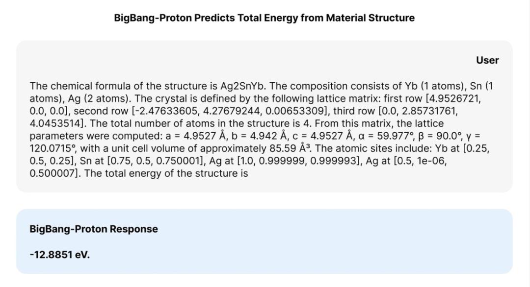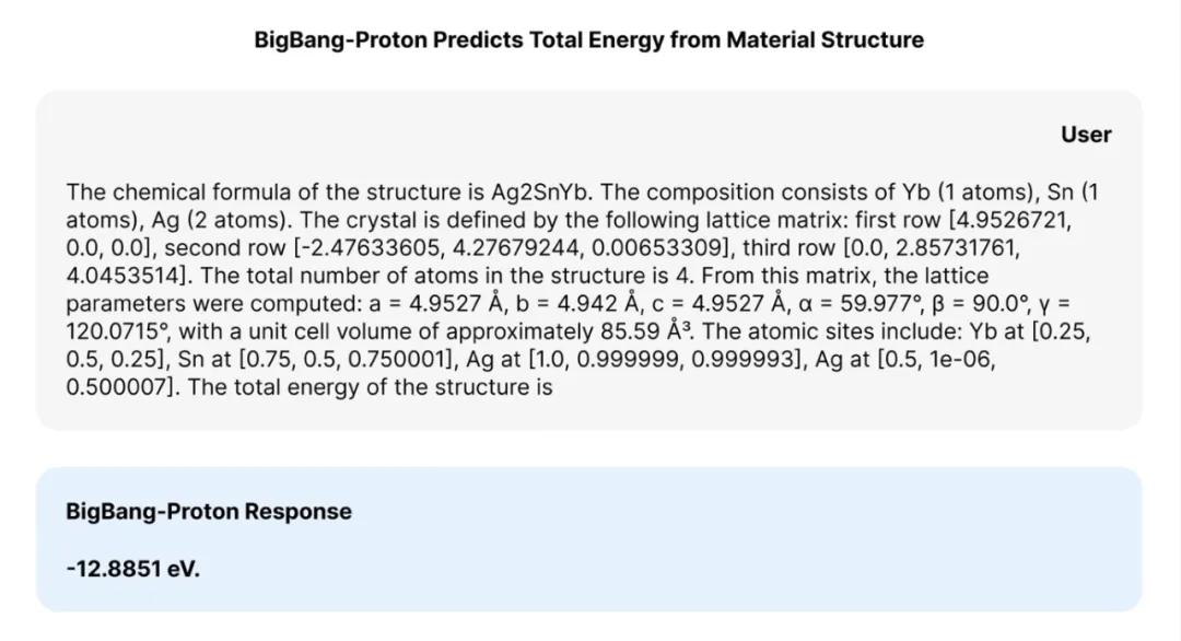 BigBang-Proton 通过零样本提示方法进行语言引导的回归来计算原子间势能模拟。材料结构数据被分解为多个部分,每个部分都嵌入到相应的文本描述中。BigBang-Proton 学习了整合了理论描述和实验数据的完整上下文,以做出最终推理。