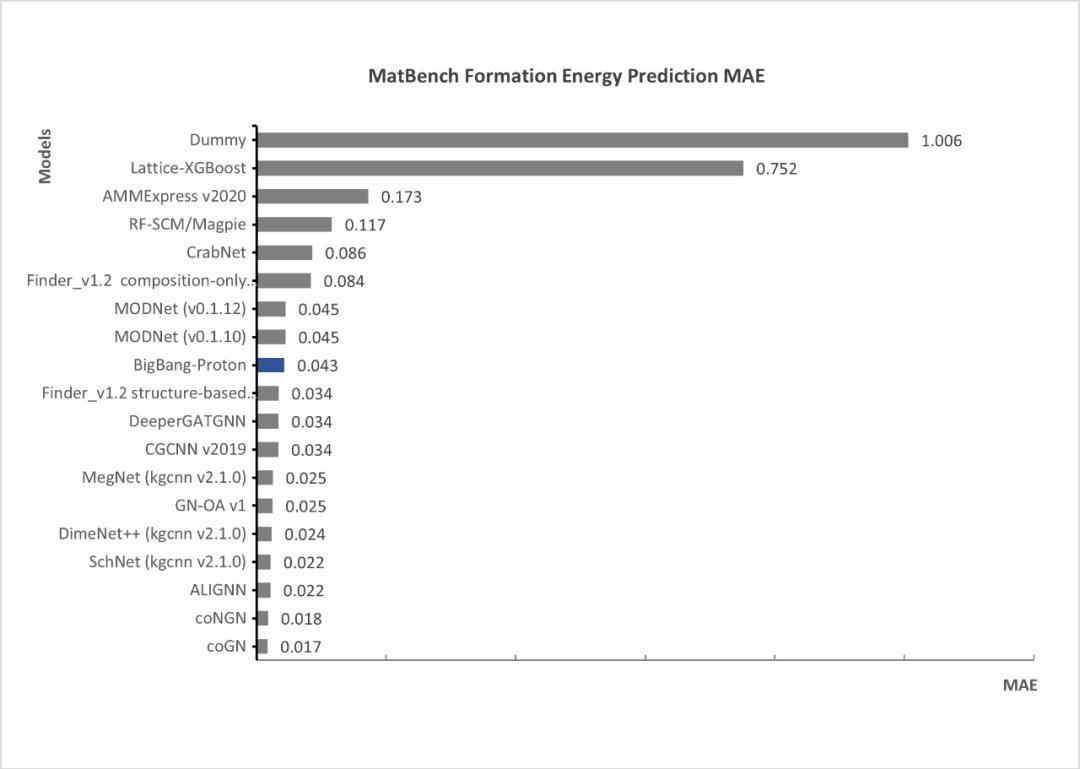 Matbench 基准列出了 13 个任务,其中 10 个是回归任务,3 个是分类任务。对于 3 个分类任务,超对称可以应用模型通过回归生成中间结果。超对称选择回归任务“形成能预测”来展示 BigBang-Proton 在语言引导的回归的能力。BigBang-Proton 在形成能预测中实现了 0.043 eV/atom 的平均绝对误差(MAE),在 Matbench 排行榜上排名第 11 位。
